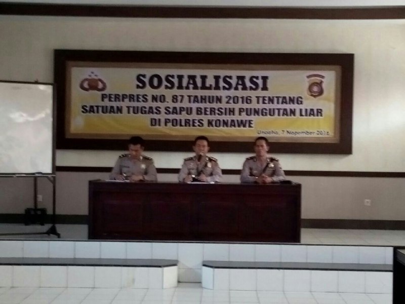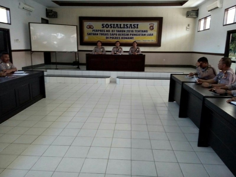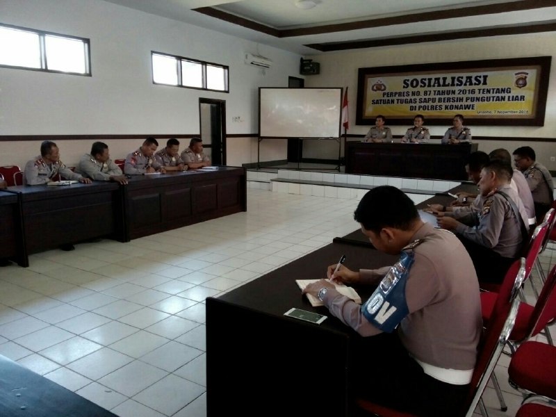 Bertempat di aula polres konawe di adakan kegiatan sosialisasi internal Polres Konawe terkait perpres no. 87 tahun 2016 tentang satuan tugas sapu bersih pungutan liar di Polres Konawe, senin 6 nov 2016.