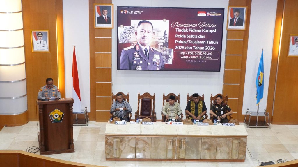 Tribratanews.sultra.polri.go.id – Kendari – Kepolisian Daerah (Polda) Sulawesi Tenggara turut berpartisipasi dalam Rapat Koordinasi Pemberantasan Korupsi Pemerintah Daerah Sulawesi Tenggara Tahun 2026 yang dilaksanakan di Ruang Pola Kantor Gubernur Sulawesi Tenggara, Kamis (29/1/2026).
