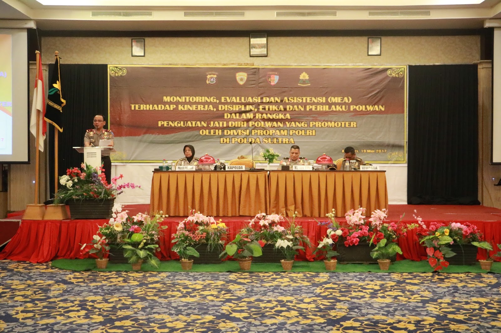 polda, para Kapolres jajaran, seluruh polwan jajaran polda sultra dan Bhayangkari Polda sultra.Mengawali kegiatan tersebut kapolda sultra dalam sambutannya sangat senang dengan hadirnya tim dari mabes polri yang dalam hal ini pejabat Div Propam Polri.